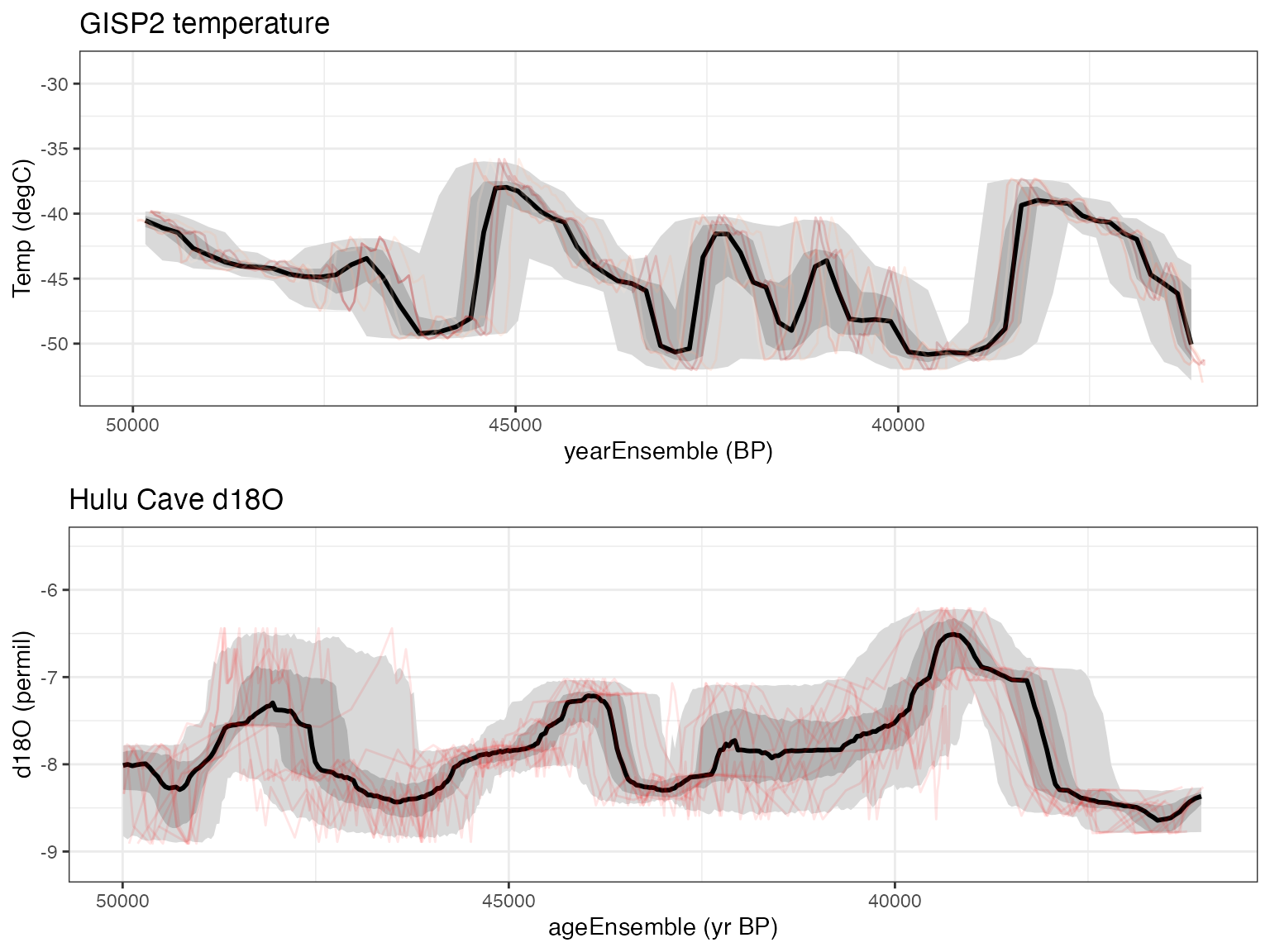 gisp2.ens <- convertAD2BP(gisp2.ens)Let’s make another ribbon and lines plot, this time useing the magrittr pipe to streamline the process