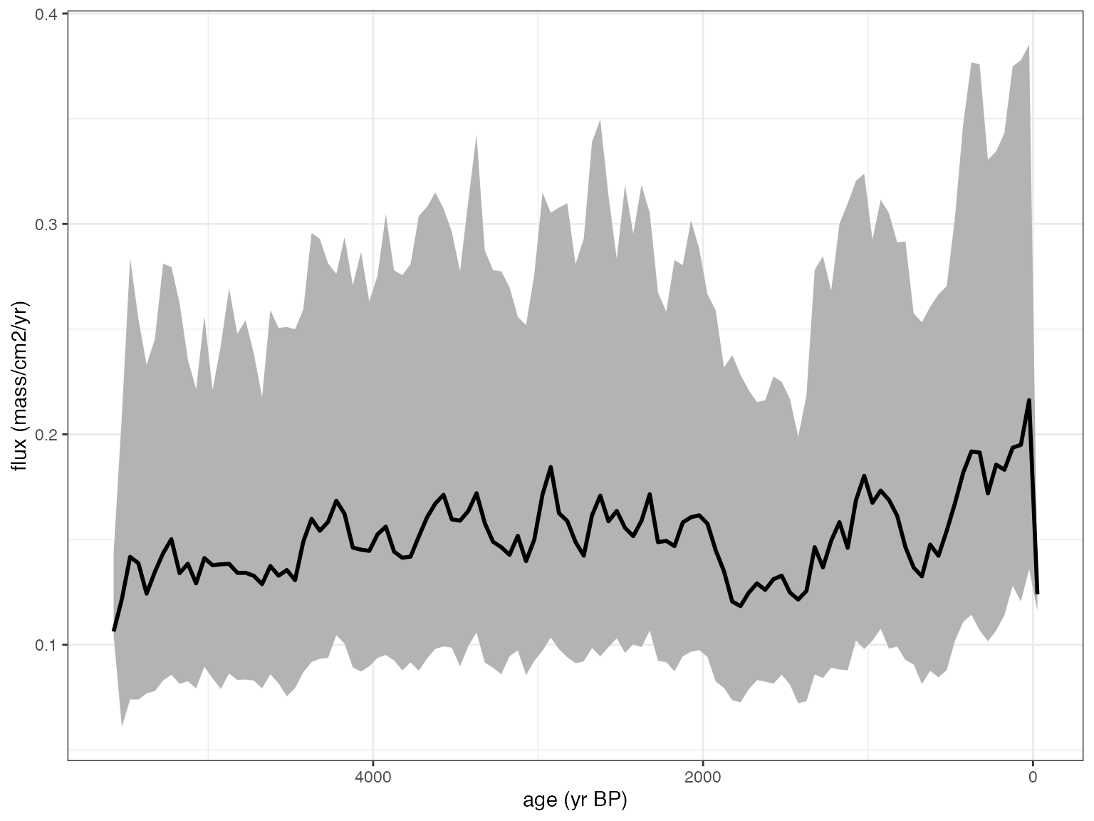 plotTimeseriesEnsRibbons(X = srAgeEns, Y = srEns,probs = c(0.25,0.5,0.75), x.bin = seq(-70,5500,by = 20))