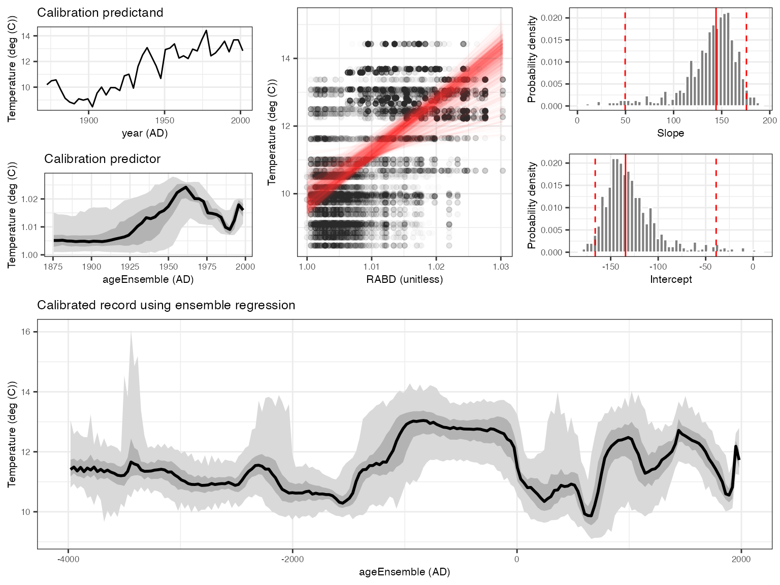 OK, you’ve convinced yourself that you want to use RABD to model temperature back through time. We can do this simply (perhaps naively) with regession, and lets do it with age uncertainty, both in the building of the model, and the reconstructing