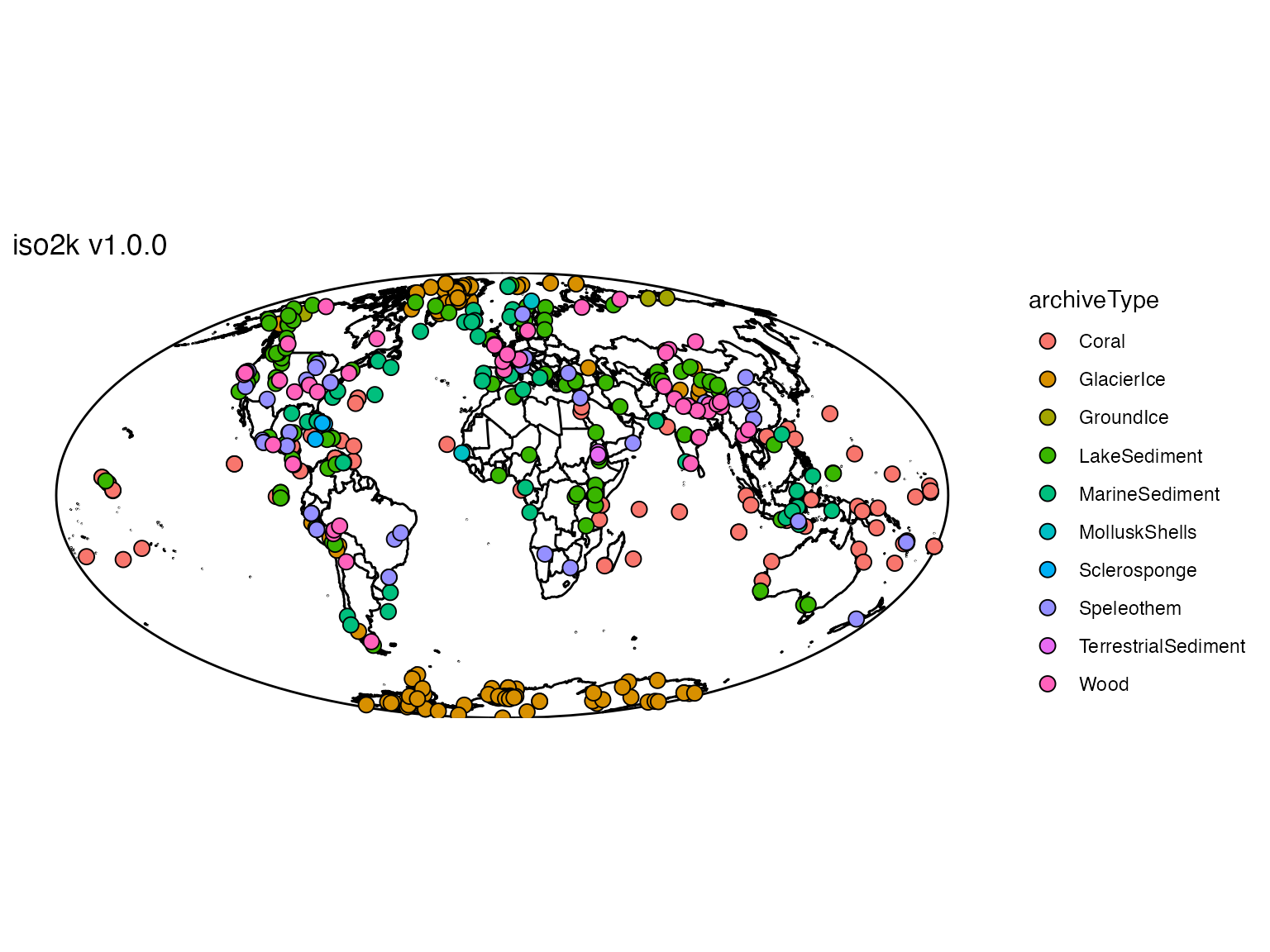 tidyIso2k.RmdThis vignette highlights how to filter, plot and map a library of LiPD data, but this time using the tidyverse framework. As before first let’s load version 1.0.0 of the iso2k database. Check out the details of the iso2k dataset Earth System Science Data.
